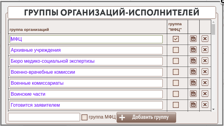 Колонка "Группа/ Обслуживаемая территория" показывает отношение организации - к группе организаций - к территории