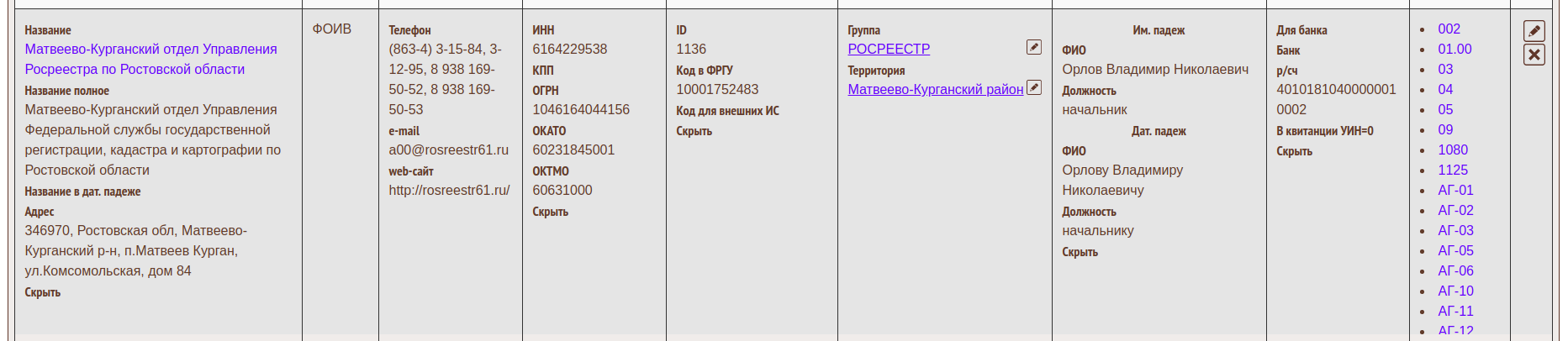 Колонка "Используется в услугах" показывает список услуг, в которых используется организация. Отображается реквизит «Код». В случае, если он не заполнен - «Внутренний код» услуги. Если организация используется более, чем в одной услуге, то выводится первая услуга и текст «Раскрыть», позволяющий увидеть весь список: