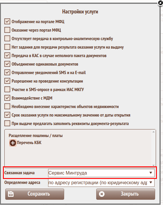 в паспорте услуги указать, что данная услуга обрабатывается Модулем, для этого в поле "Задача с которой связана услуга" указываем "Сервис Минтруда"