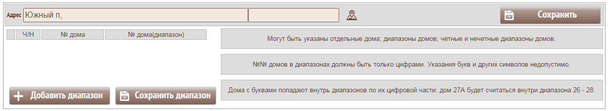 можно определить четные, нечетные или все дома заданной улицы, которые входят в описываемую строку. При вводе диапазона домов в колонке