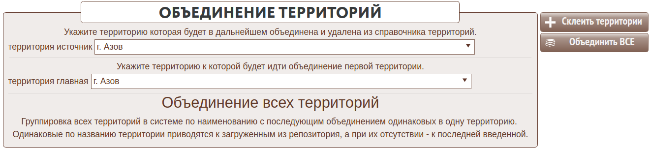 Существует возможность объединенения территорий путем склеивания их в один экземпляр. При этом происходит перенос всех зависимостей удаляемой территории на идентификатор новой. Эта возможность позволяет навести порядок среди территорий, убрав их дубликаты.