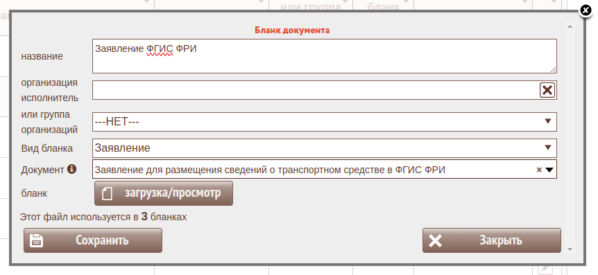 Также на форме может отобразиться надпись "Этот файл используется в ХХ бланках" - это значит, что система нашла другие бланки(возможно в других услугах) с идентичным шаблоном заявления и при изменении шаблона предложит автоматически его поменять и в других бланках(в других услугах) тоже.