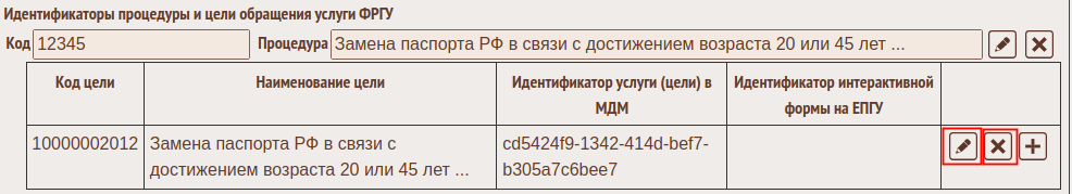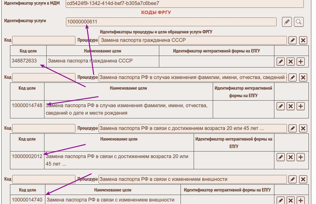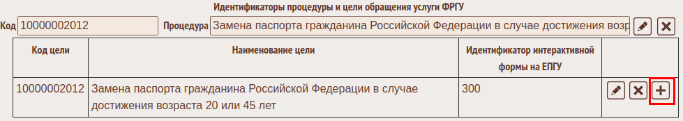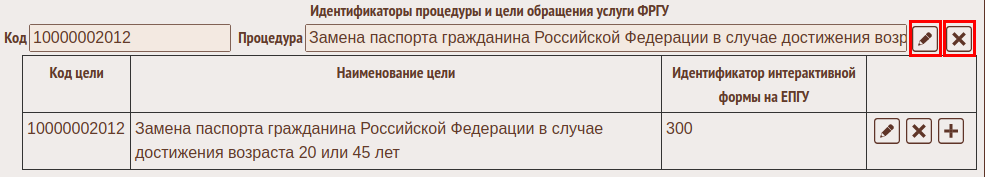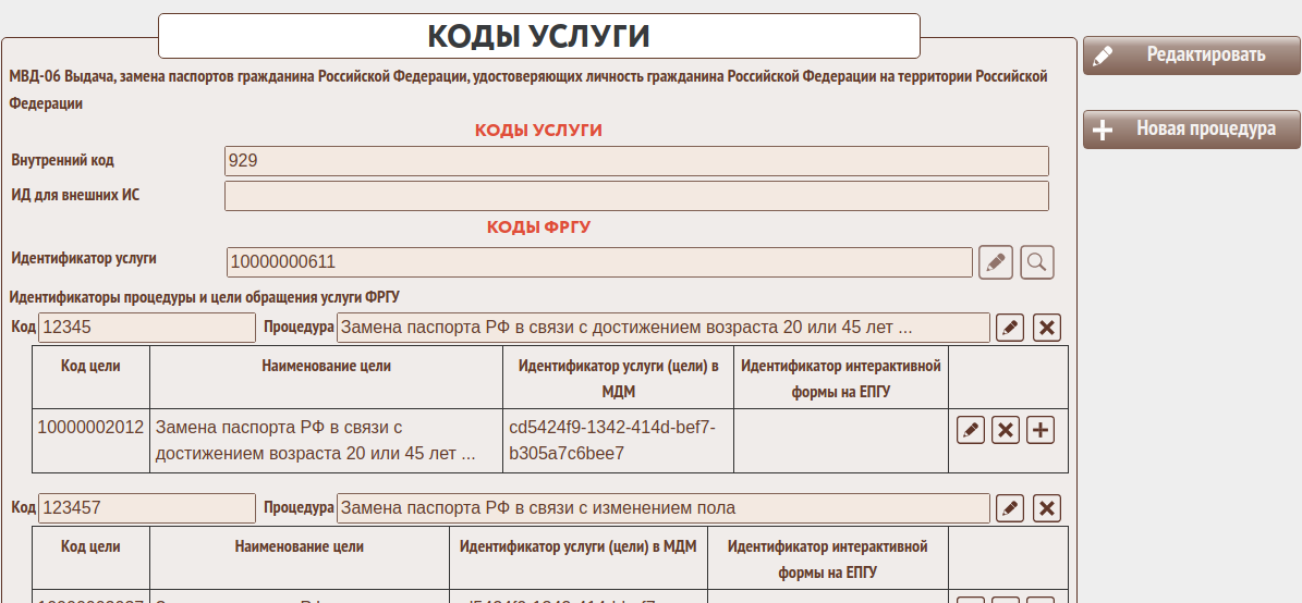 Для услуги могут быть введены несколько Идентификаторов процедуры, для каждого из которых обязательно указание одной или нескольких Идентификаторов цели обращения