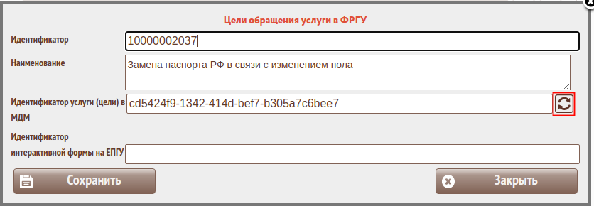 Для цели обращения можно указать также Идентификатор услуги (цели) в МДМ - код услуги и цели, с которым она зарегистрирована в ИС МДМ.