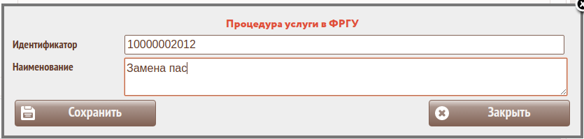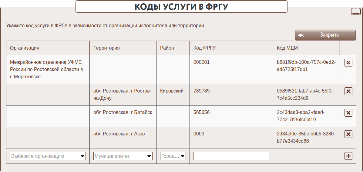 открывается форма, позволяющая ввести идентификатор услуги в ФРГУ для каждой организации-исполнителя или территории: