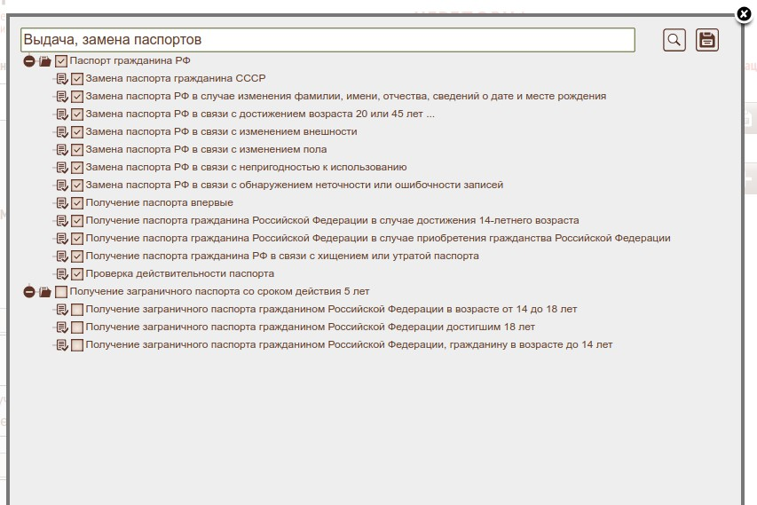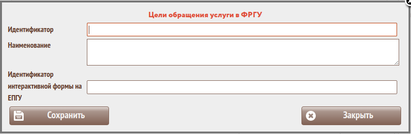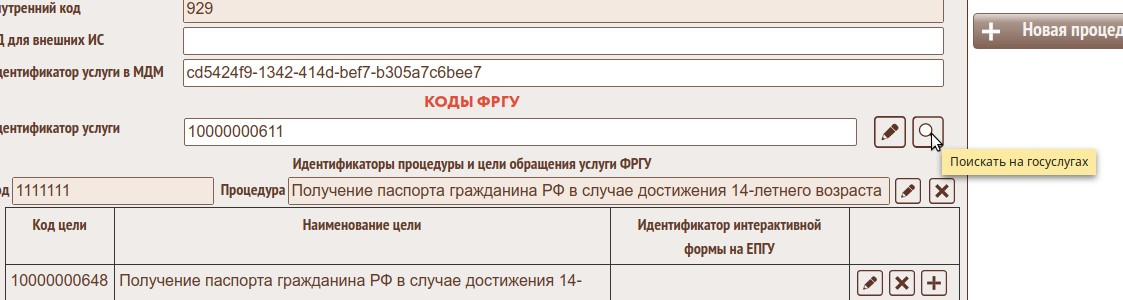 По нажатию на кнопку "Поискать на госуслугах" можно произвести поиск кодов услуг используя API сайта gosuslugi.ru. Чтоб работал данный механизм необходимо обеспечить доступность сайта gosuslugi.ru с вебсервера МФЦ. При таком поиске - на госуслуги предается название услуги, госуслуги ищут в своей базе подходящие по названию услуги и возвращают сместе с кодари из реестра ФРГУ. На стороне МФЦ найденные услуги отрисовываются в виде дерева где корни дерева-названия услуг, листья - цели обращения. Модератор выбирает нужные цели и они вместе с кодами добавляются к целям услуги. Идентификатор услуги прописывается если выбрана услуга и все цели на ней.