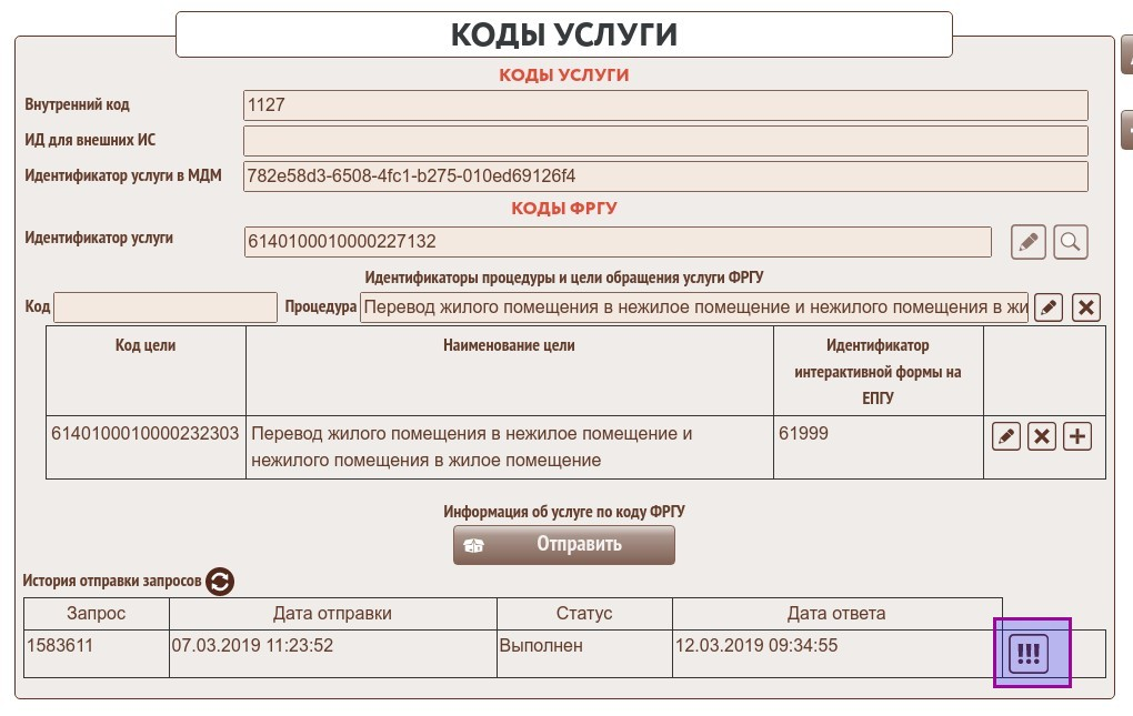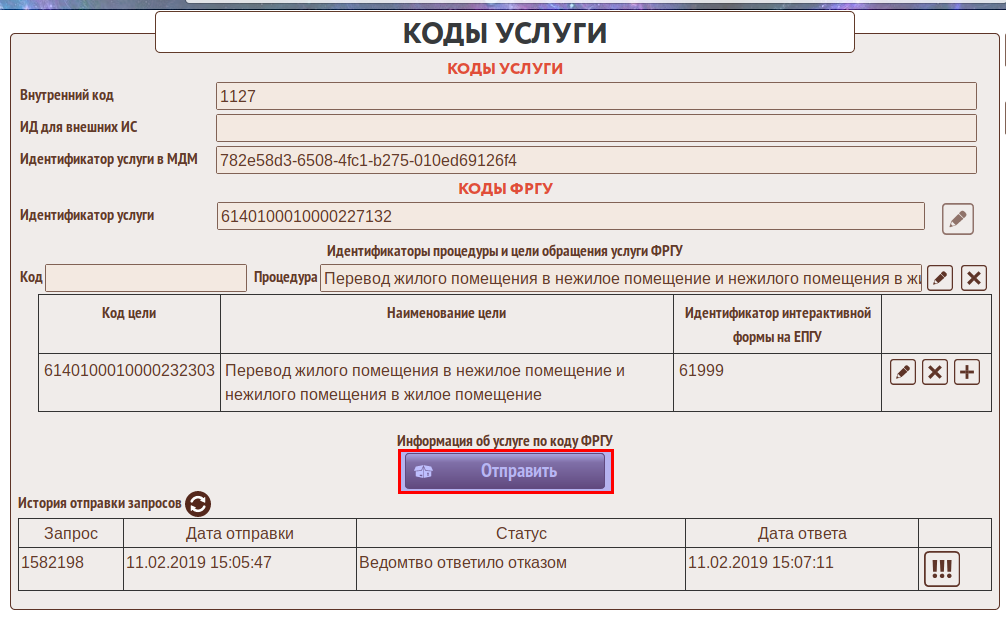 Информация об услуге по коду ФРГУ - интеграция с видом сведений СМЭВ 3 "Поиск информации об услуге по ее идентификатору". Для того чтобы выполнить запрос необходимо настроить документ+организация на алгоритм 1021 "Поиск информации об услуге по ее идентификатору". После чего зайти в необходимую услугу, убедиться что внесен "идентификатор услуги" (если нет, то внести) и нажать кнопку "Отправить".