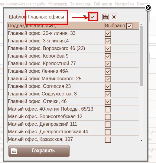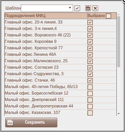 Выбранный набор подразделений может быть сохранен в качестве шаблона