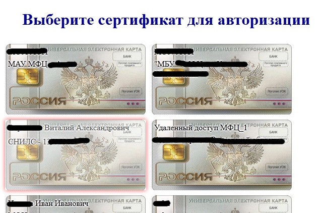При авторизации в МФЦ нужно нажать кнопку "Войти через УЭК". Откроется форма со списком сертификатов установленных на Вашем компьютере. Из списка выберите сертификат Вашей карты и нажмите "Войти". После этого Вам предложат ввести ПИН-код от карты. После успешного ввода ПИН-кода система попробует авторизоваться с указанными данными.