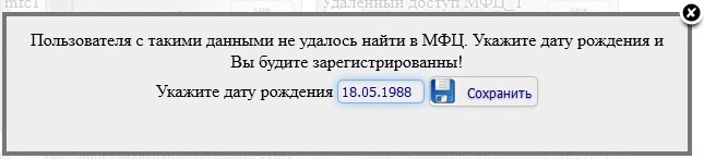 Если заявителя в МФЦ с такими данными не удалось найти Вам будет предложено зарегистрироваться (для этого нужно будет дополнительно указать дату рождения).