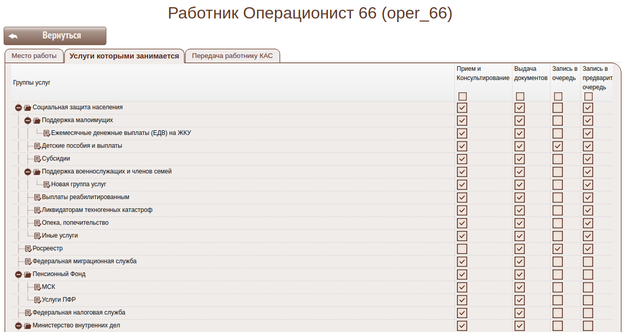 Запись в очередь - должны быть отмечены группы услуг, на которые данный пользователь имеет право записывать заявителей в текущую очередь;