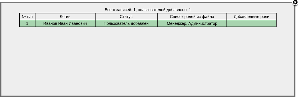 Зелёным цветом будут отмечены пользователи, которых получилось добавить в систему, красным - те, пользователи которых добавить не удалось. В графе "Статус" будет указан либо положительный статус, либо ошибка, из-за которой не удалось добавить пользователя. В колонке "Добавленные роли" будут перечислены роли, которые удалось добавить пользователю (если было найдено совпадение названия роли и подразделения в системе).
