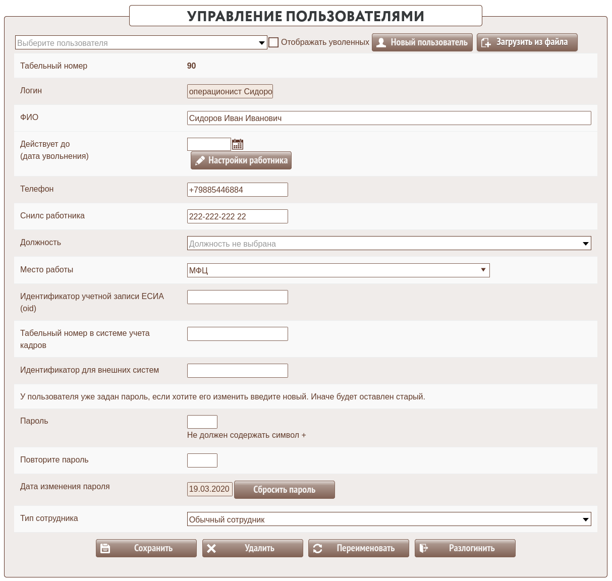 | МАУ «МФЦ Ростовской области» | Иванов Иван Иванович | Менеджер, Администратор | логин_пользователя | 1111 | 000-000-000 00 | +79885446884 | Администратор МФЦ |