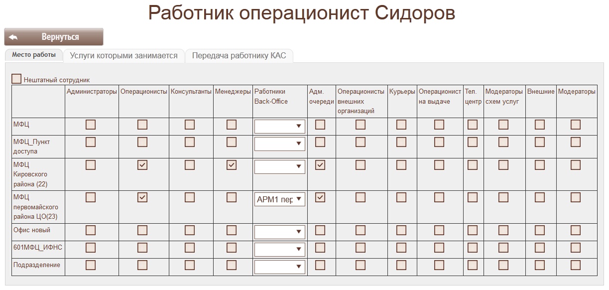 Форма предназначена для создания, назначения ролей и разрешений специалистам МФЦ.