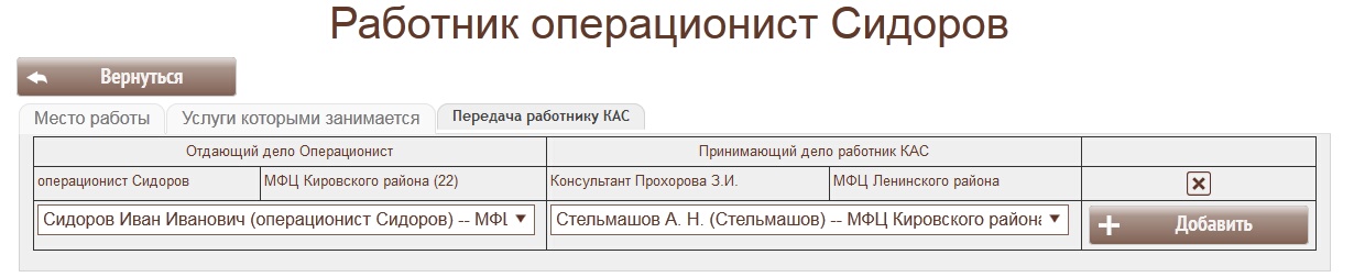 Если таблица пуста, то передача будет осуществляться по настройке структуры МФЦ наименее загруженному специалисту подразделения из списка обслуживающих подразделений КАС.