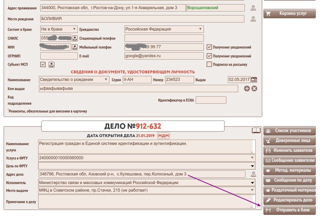 После того как настроен адрес сервиса в карточке дела появится кнопка "Отправить в банк"