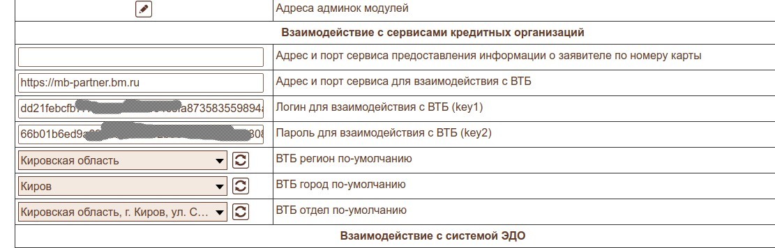 В системе есть возможность отправлять данные пользователей по их желанию в банк ВТБ, используя API банка. Чтобы настроить взаимодействие с банком нужно в форме Настройки модуля "Новое единое окно" прописать следующие параметры: * Адрес и порт сервиса для взаимодействия с ВТБ * Логин для взаимодействия с ВТБ (key1) * Пароль для взаимодействия с ВТБ (key2)