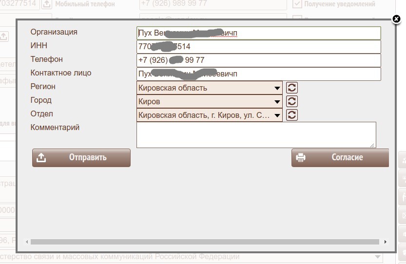 При нажатии на кнопку "Отправить в банк" откроется форма с заполненными реквизитами из карточки заявителя, оператор должен дозаполнить недостающие данные, распечатать согласие на передачу данных и отправить данные в банк.