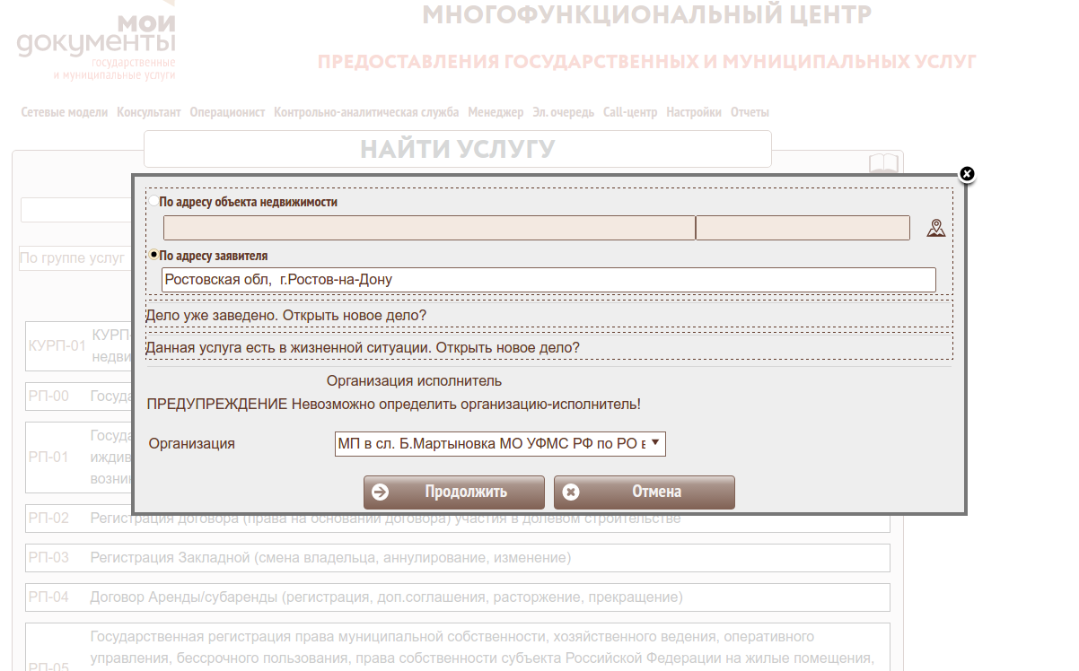Далее по адресу определяется организация, исполняющая услугу. Если однозначно определить организацию не удалось, операционисту предоставляется возможность выбрать ее.