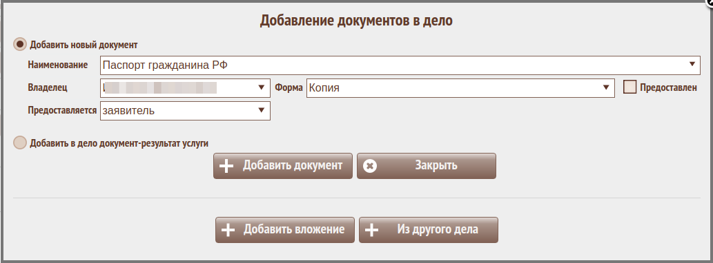 Здесь можно добавить документ из справочника, добавить документ-результат услуги, обозначенный таковым в справочнике услуг, добавить документ-вложение в дело, и добавить документ из другого дела данного заявителя.