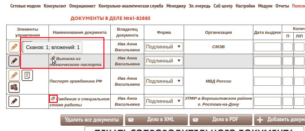 Существует возможность просмотра информации из прикрепленных документов. При наведение на название документа запрашивается информация о реквизитах документа и выводится работнику.