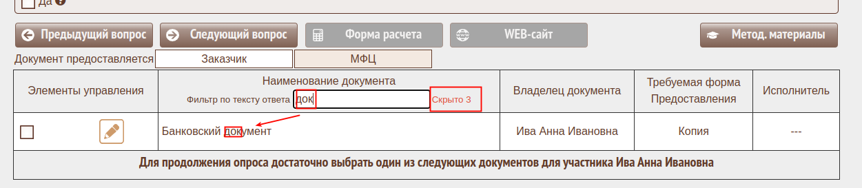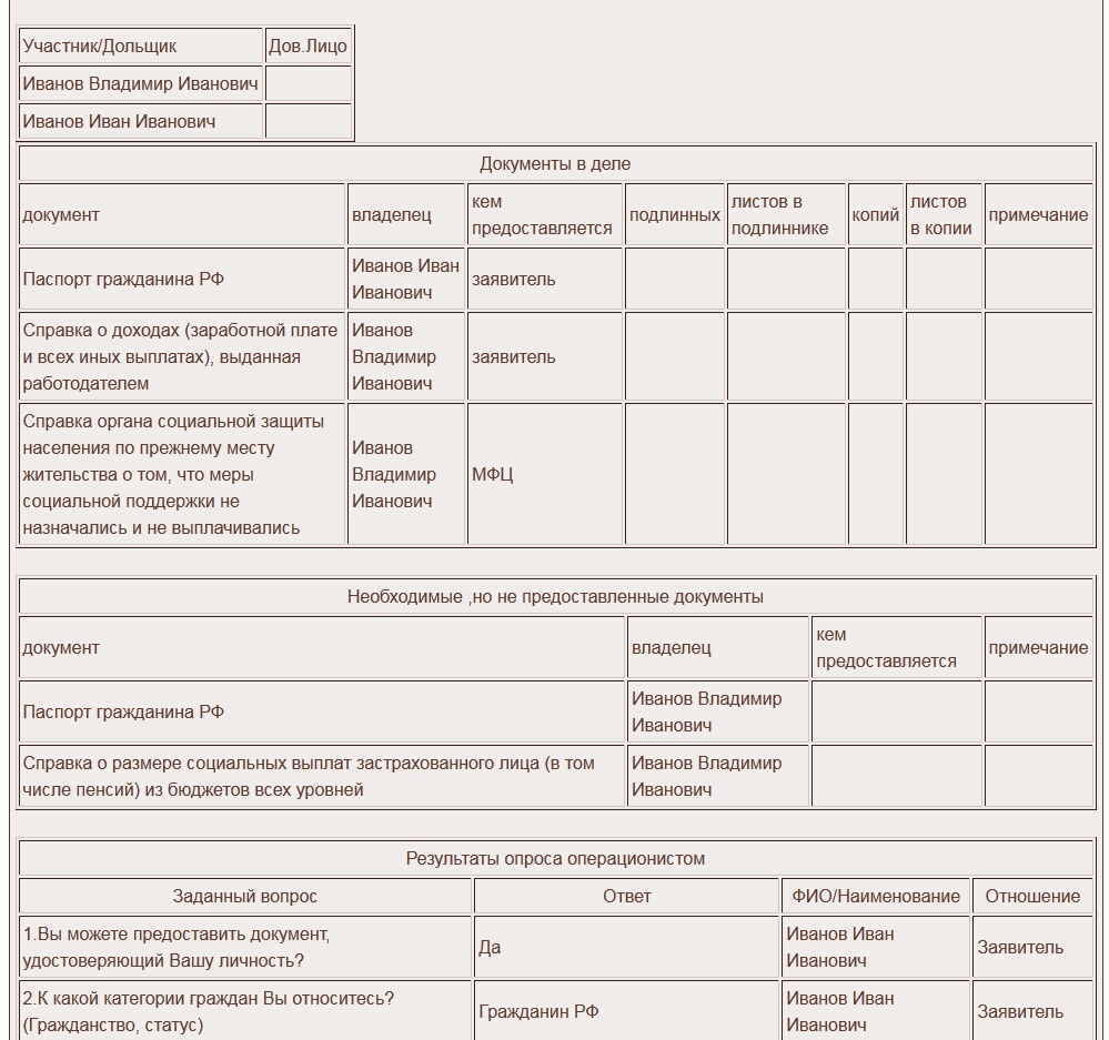 Предоставленные документы необходимо отметить и перейти к следующему вопросу. По окончании опроса выдается форма документов в деле