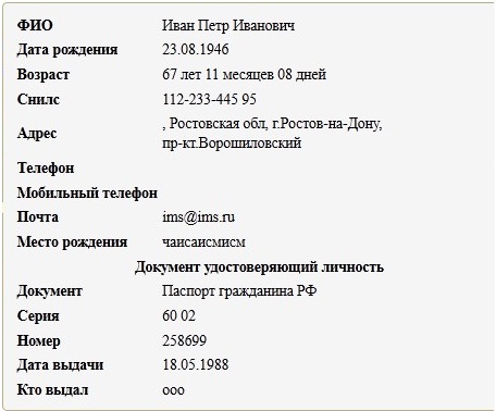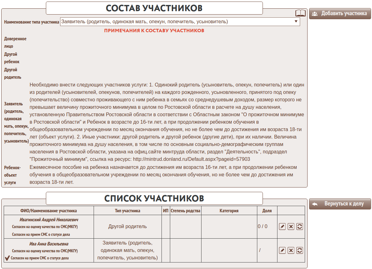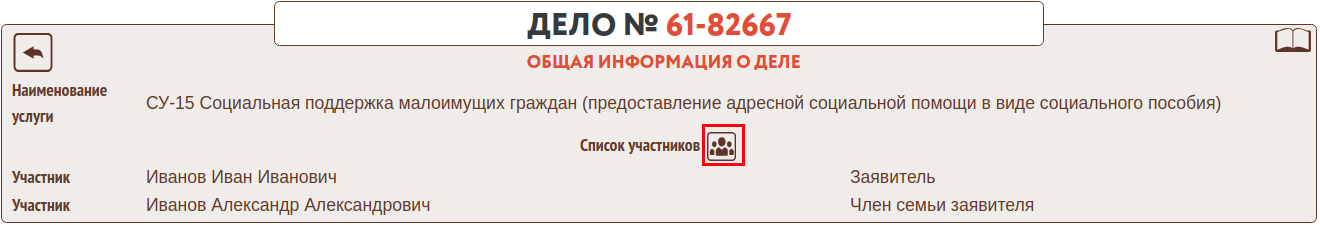 При наведении на ФИО заявителя и на ФИО участников услуги отображается информация из личной карточки: