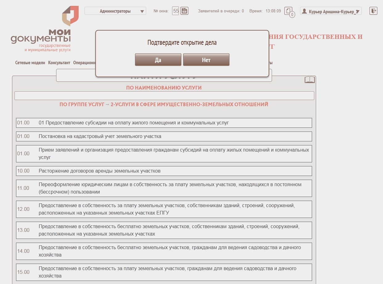 При открытии нового дела по группе услуг выбирается нужная услуга. При этом выдается форма требующая подтвердить необходимость открытия дела.