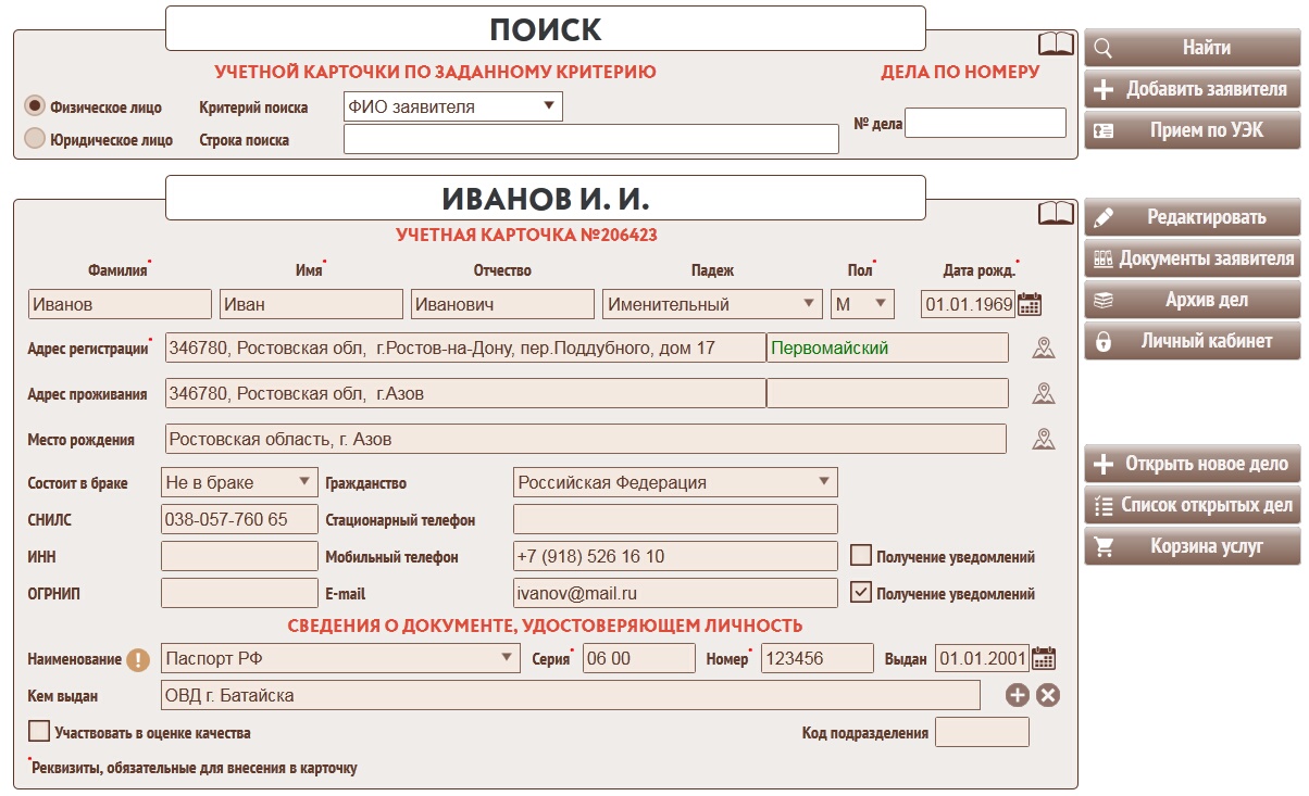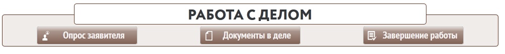 Работа с делом начинается с поиска Заявителя в базе данных. Если Заявитель пришел первый раз, необходимо ввести его карточку.