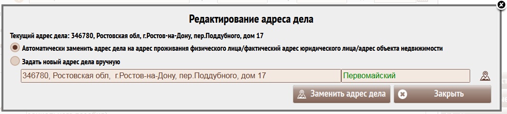 В момент открытия дела в зависимости от настройки типа адреса в справочнике услуг в деле фиксируется адрес. Если требуется изменить адрес дела, для этого при нажатии кнопки