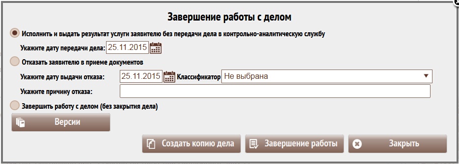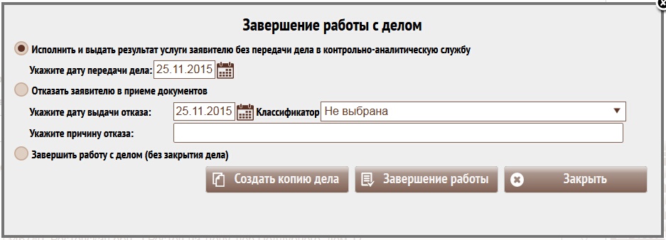 В случае, если у услуги нет контрольно-аналитической службы, то форма завершения работы с делом будет выглядеть так