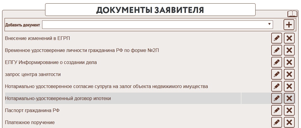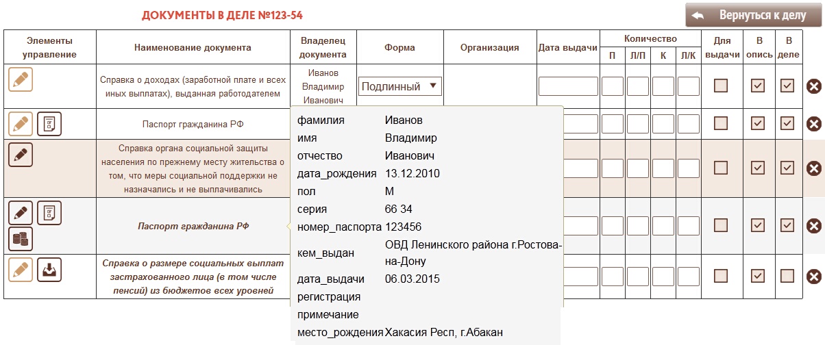 Таблица с необходимыми документами содержит элементы управления, аналогичные описываемым ниже в форме "Документы в деле".