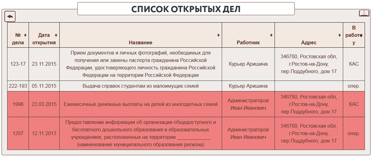 Кнопка список открытых дел позволяет просмотреть все дела, находящиеся в работе по этому Заявителю и выбрать из него нужное для дальнейшей работы.