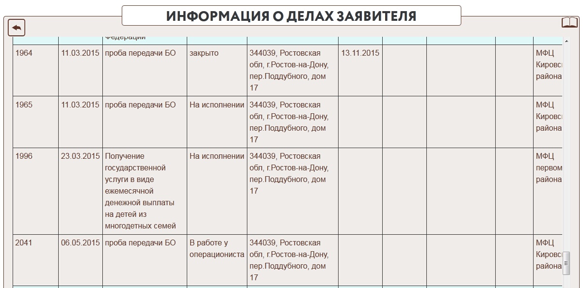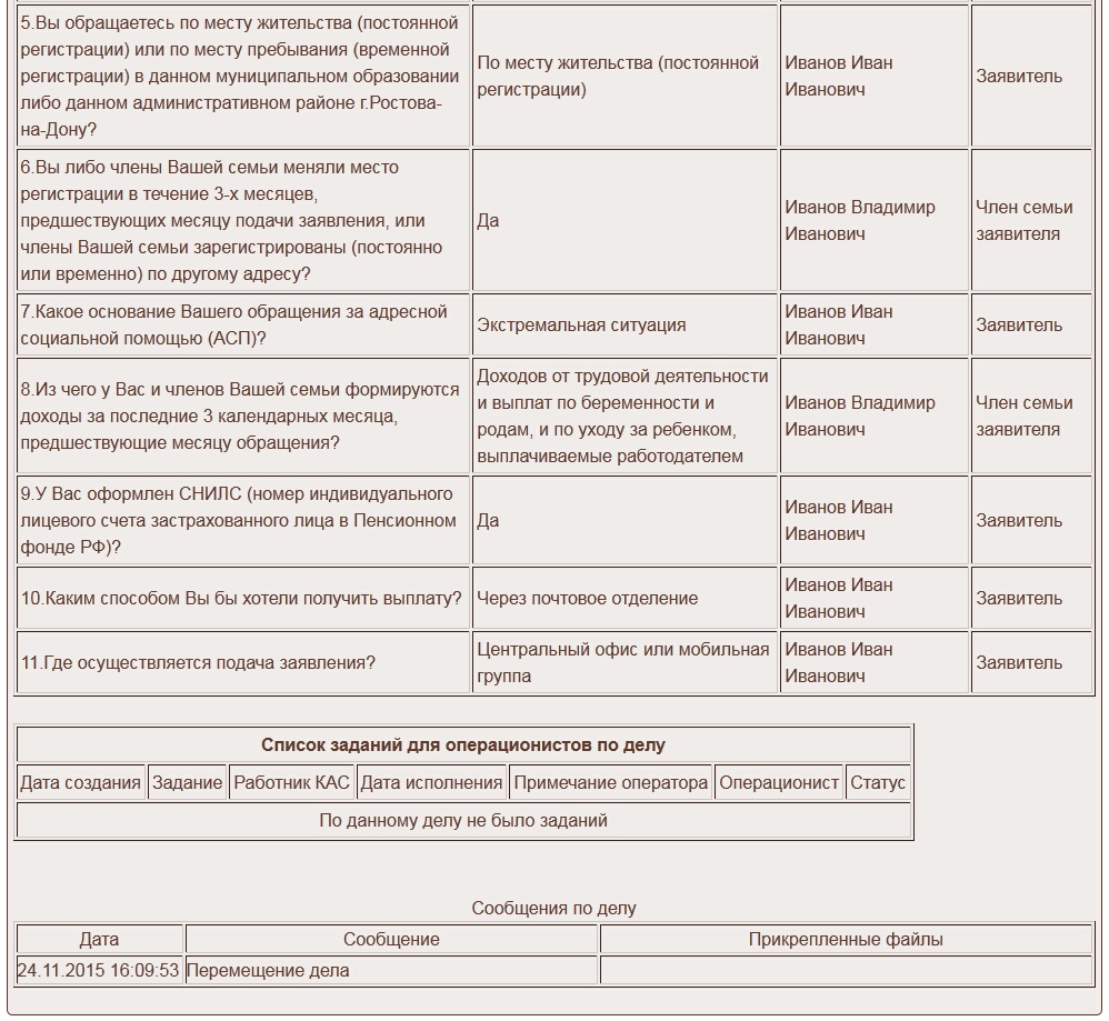 есть возможность просмотра всех дел заявителя, с просмотром их состояния (закрыто, исполняется, закрыто с отказом, в работе у операциониста)