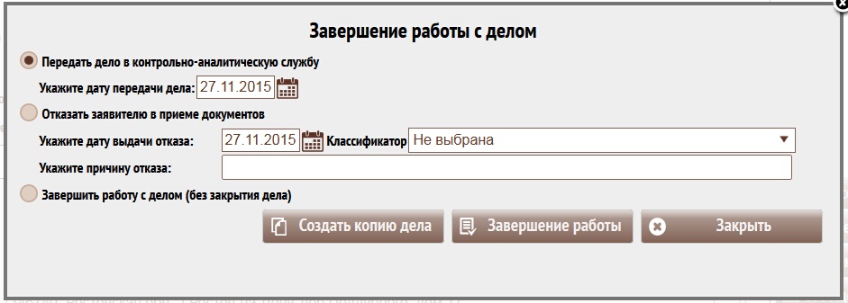 при этом есть выбор действий, необходимых в данный момент, передать дело на исполнение в КАС, отказать заявителю в принятии документов, с указанием аргументированной причины, например, из-за отсутствия полного пакета необходимых документов, или временно завершить работу с делом (без закрытия дела).