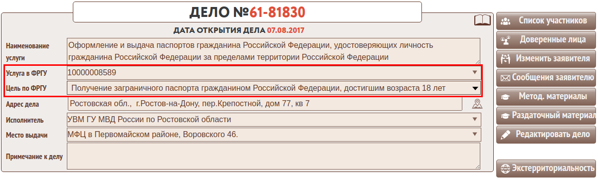 Если у услуги указаны несколько Идентификаторов услуги в ФРГУ для каждой территории, то в качестве Идентификатора услуги в ФРГУ будет установлено значение, соответствующее территории адреса дела.