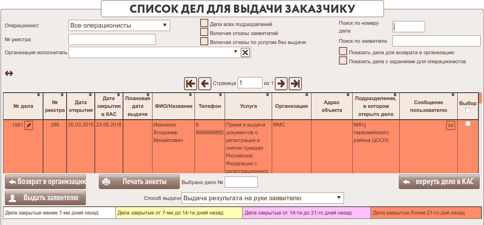 При выдачи дела фиксируется дата выдачи. Для определения удовлетворенности посетителей работой МФЦ, печатается анкета.