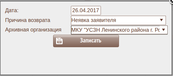 - вернуть дело в организацию исполнитель (например, когда Заявитель отказался получать результат исполнения услуги или не явился за результатом в течение установленного срока) кнопкой