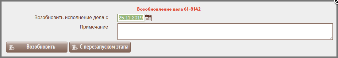 Из списка выбирается дело, выполнение которого нужно возобновить. Далее необходимо указать с какого числа возобновляется исполнение дела.