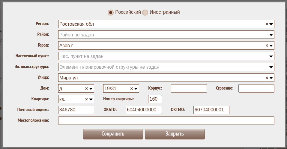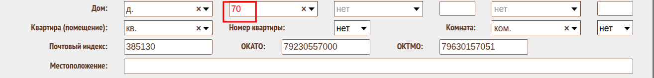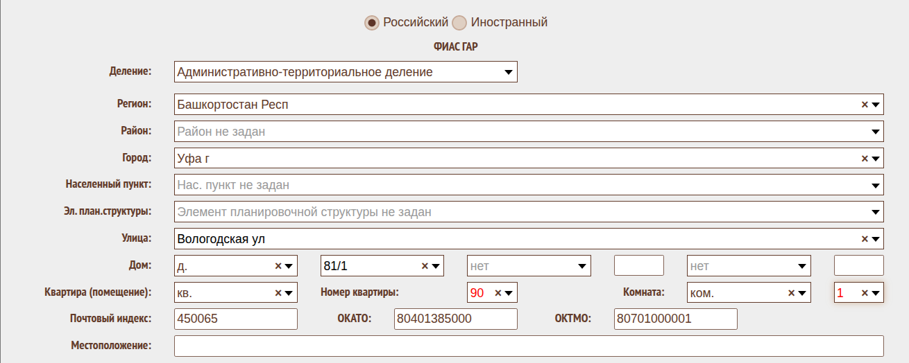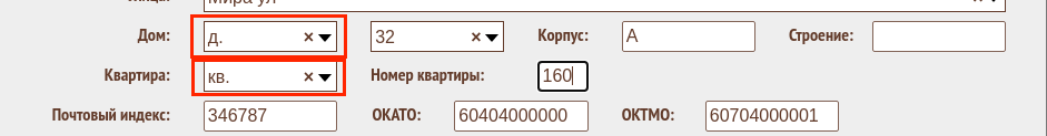 Почтовый индекс, ОКАТО и ОКТМО проставляются автоматически по мере ввода элементов адреса из справочников ФИАС (до дома), но могут быть исправлены вручную при необходимости.