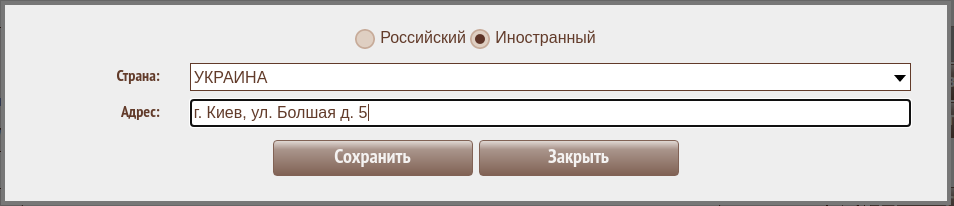 Если вводится адрес за пределами России, то указывается опция "Иностранный", выбирается страна из справочника стран мира и вводится адрес строкой без привязки к справочникам.
