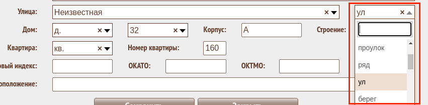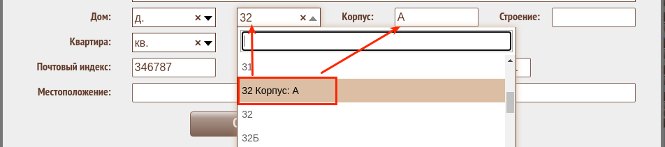 При вводе номера дома также используется справочник ФИАС. Если дом имеет номер и корпус, определенные справочником, то соответствующие поля будут заполнены.