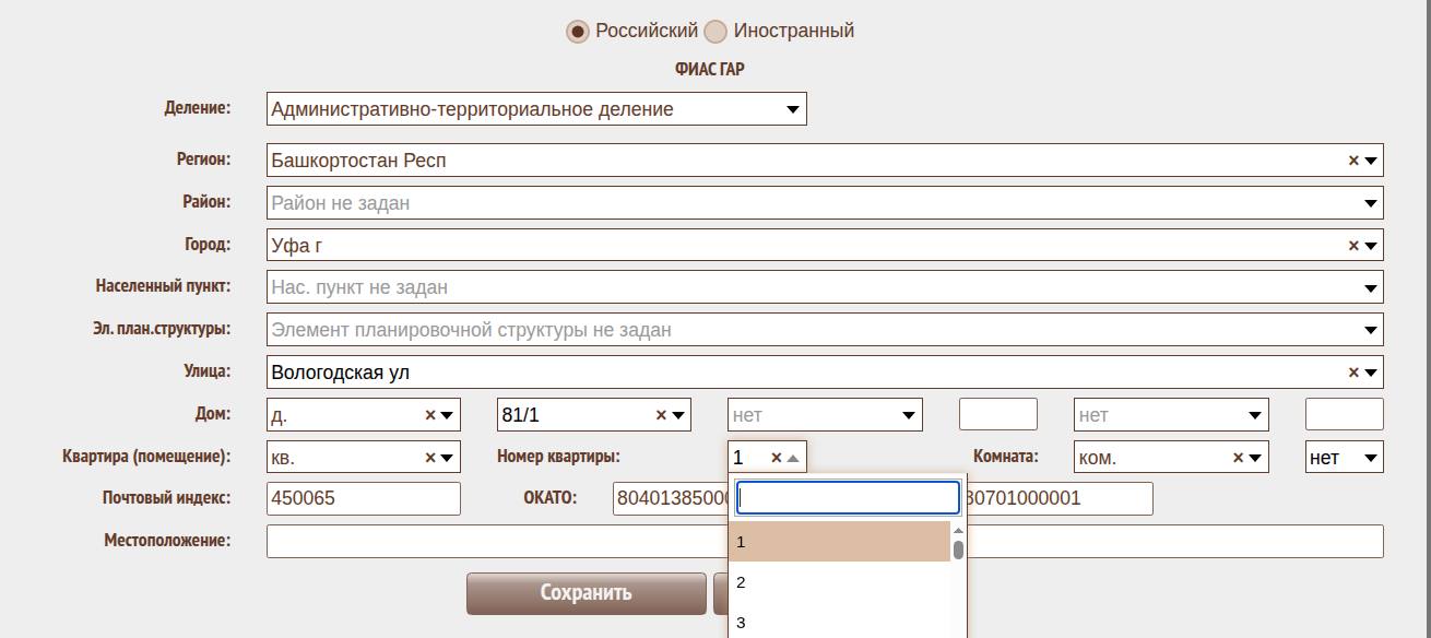 Для адресов РФ вся информация выбирается из справочников ФИАС.