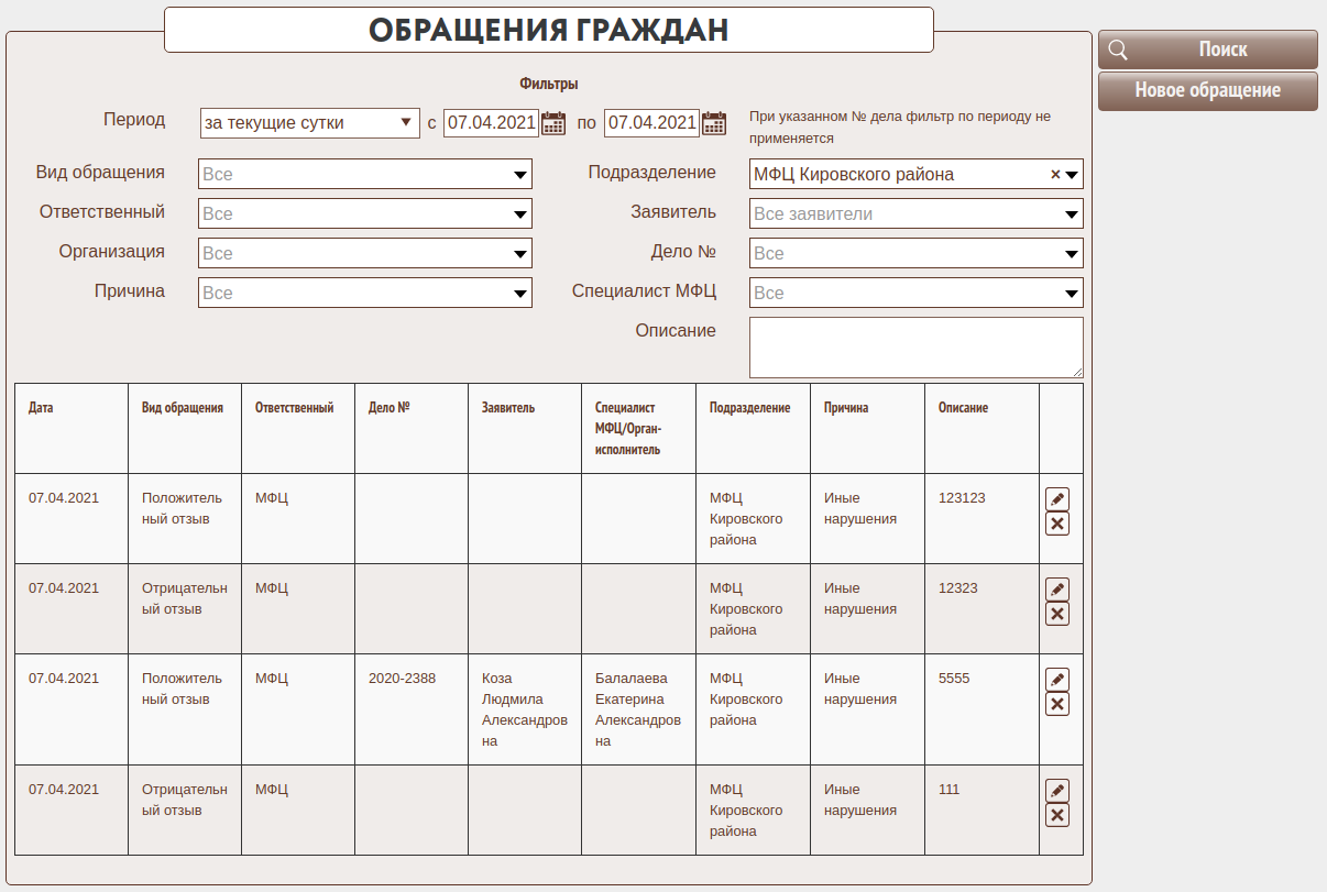Кнопка "Поиск" предназначена для отображения информации о введенных обращениях в соответствии с указанными фильтрами.