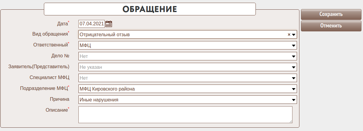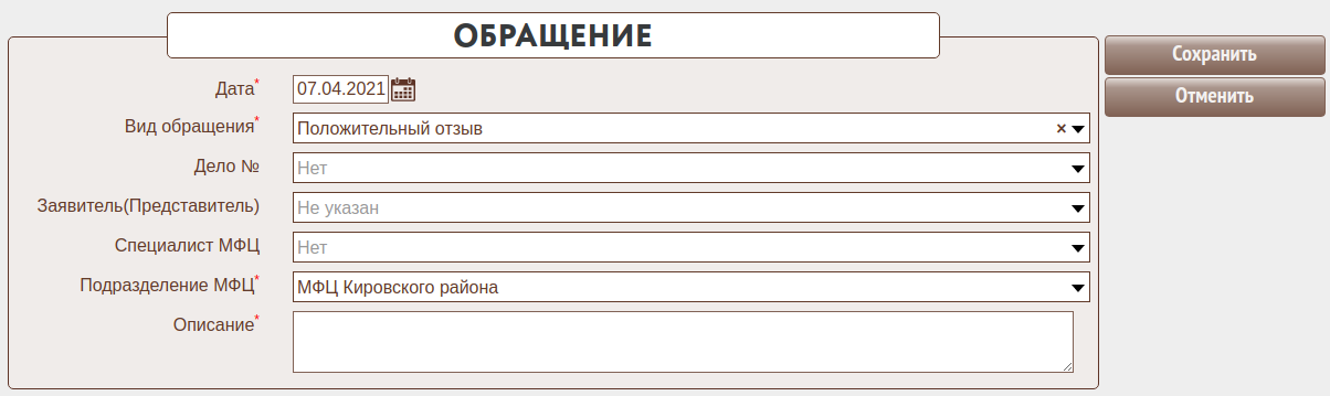 Форма позволяет ввести информацию о жалобах и положительных заявителей, поданных в МФЦ.