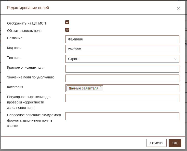 Есть список зарегистрированных кодов полей для автоматизации процесса создания дела и поиска заявителя в системе.