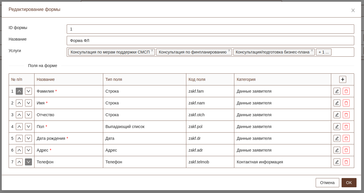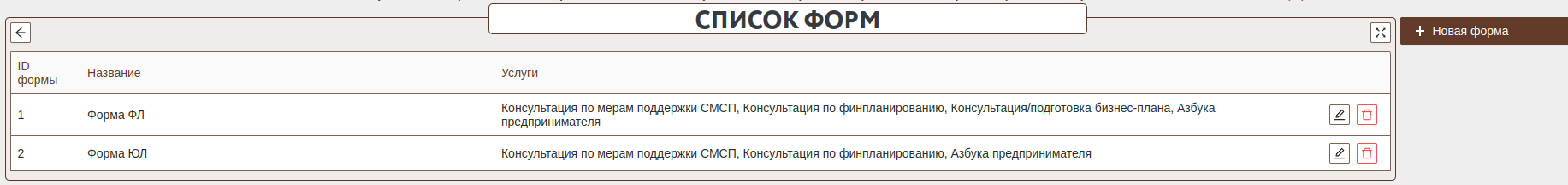 При создании формы необходимо указать уникальный ID формы (Любое цифровое значение), название формы, список услуг мсп и поля для отображения на сайте МСП.