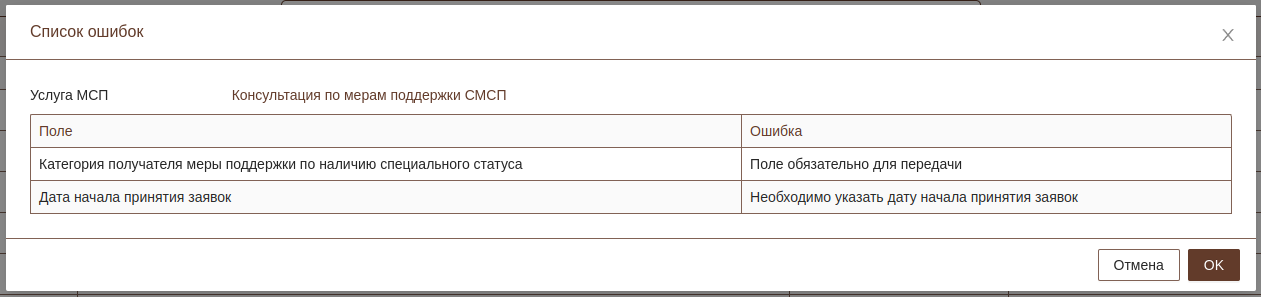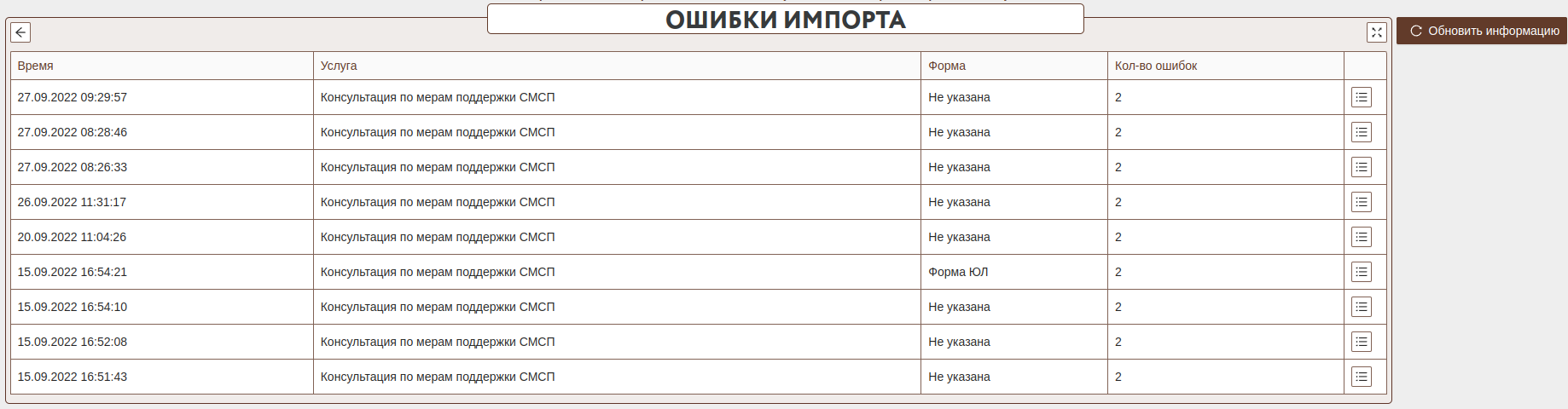 Данная форма отображает все ошибки при импорте услуг и форм заявлений. ЦП МСП будет самостоятельно запрашивать список услуг и при возникновении ошибки на стороне ЦП МСП отправлять информацию в систему.