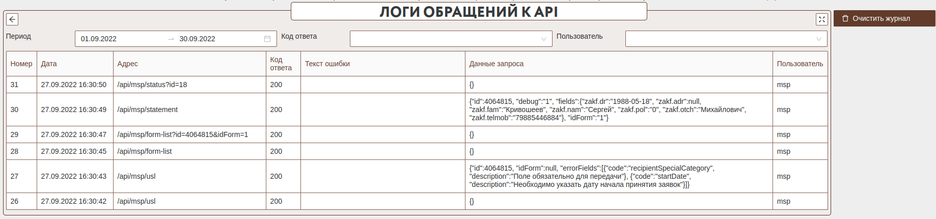 Все обращения к API (кроме авторизации) логируются в системе. При необходимости можно просмотреть какие эндпоинты были запрошены, с какими параметрами и какие статусы ответа были отправлены потребителю.