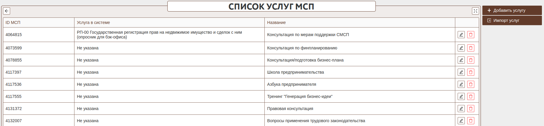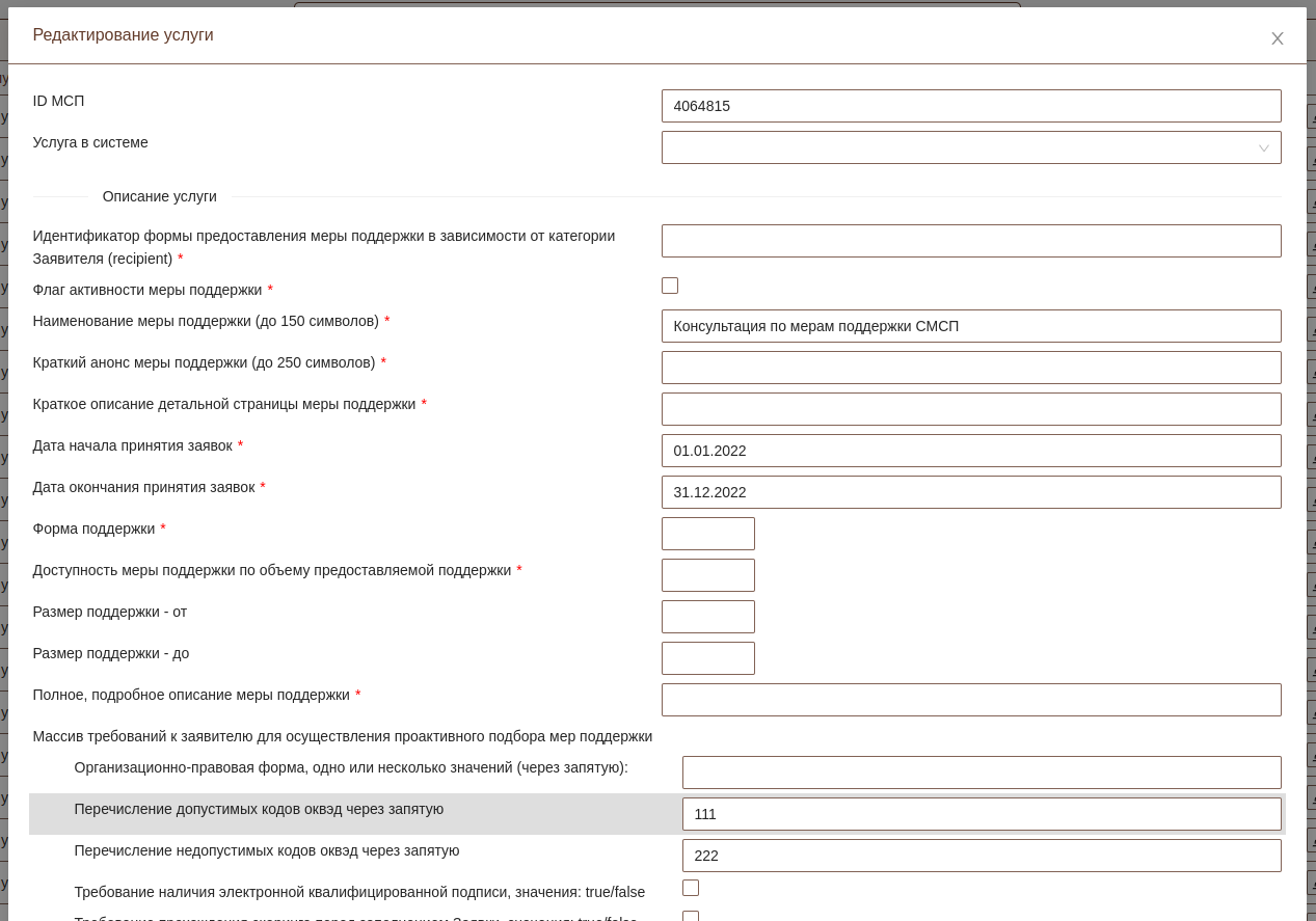 Для каждой услуги необходимо указать описание услуги. Данные поля будут отправлены в ЦП МСП и будут отображены при подаче заявлений. Необходимо указать уникальное ID МСП для каждой услуги.